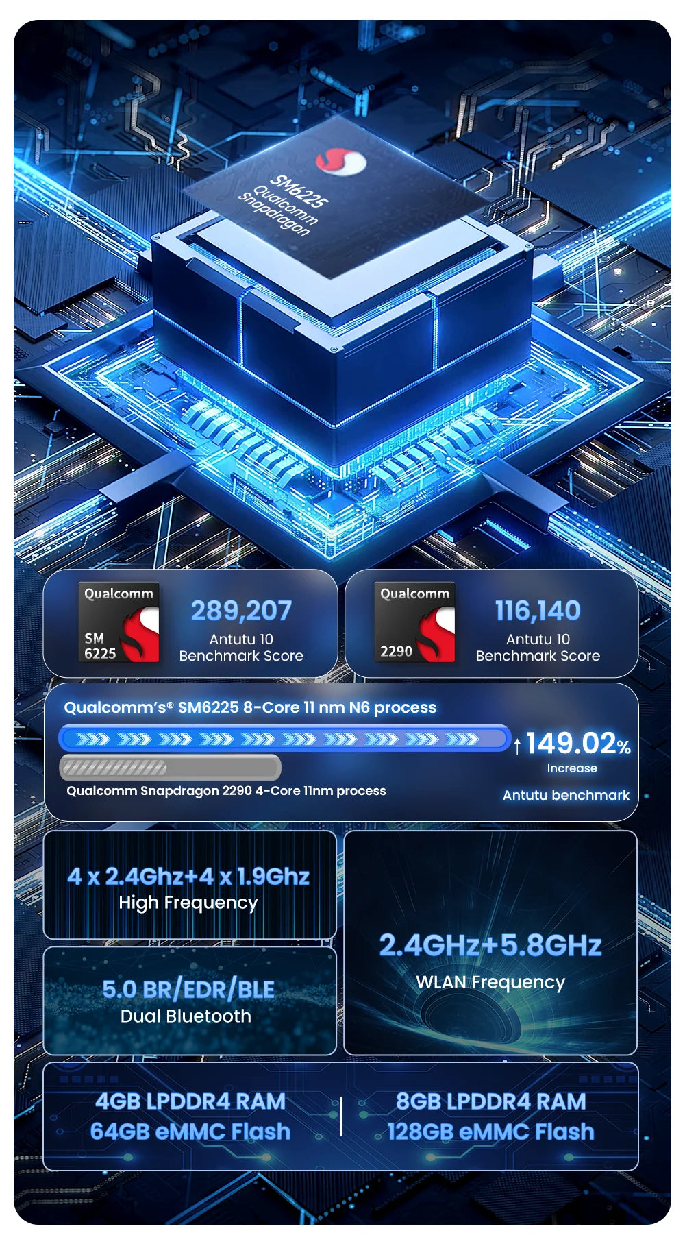 1.Experience lightning-fast performance with the Qualcomm Snapdragon SM6225 8-core processor. From seamless multitasking to immersive gaming, unlock the power of cutting-edge technology at your fingertips.