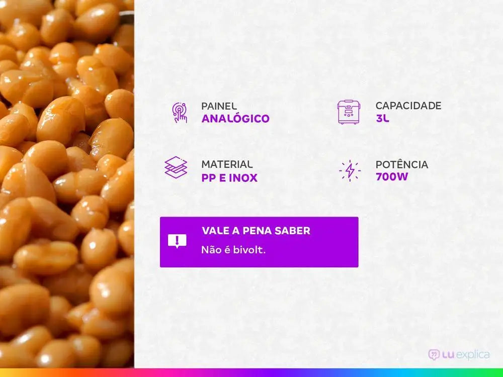 If you are looking for practicality and more freedom when preparing your recipes, come with me to see this Electric Pressure Cooker from Mondial. For starters, this pressure cooker has an analog panel, to choose the functions of time and temperature. This pot is made in PP and Stainless Material and has Capacity of 3L, which you can use to make Beans, Soup, Rice, Brown Rice, Fish, Pork, Beef, Muscle, vegetables, sautéed and even sweets. This model PE-47-3L-I has the power of 700W and will be a blast in your kitchen since it is indicated for residential use. With this electric pressure cooker from Mondial, you can still use the function programming button, use the timer, and even be quiet with the automatic shutdown. The cover is with ergonomic handle, thermal, practical and with a safety lock. Accompany spoon, measuring cup, and cookbook. It's important to keep an eye on the model voltage, okay? This pan is 220V.