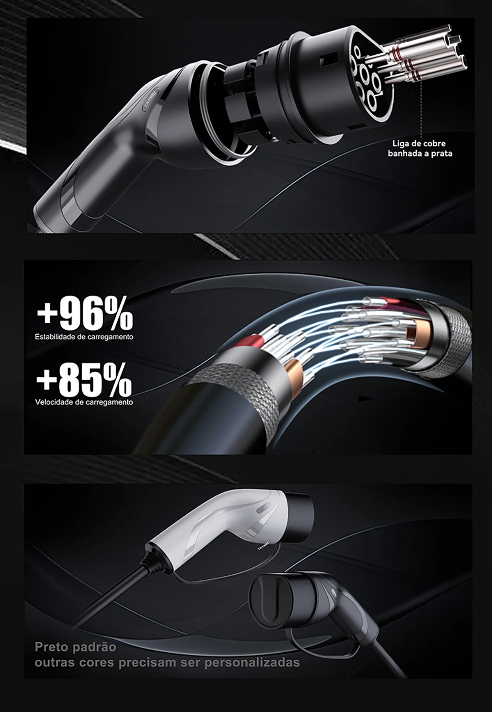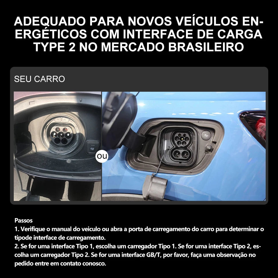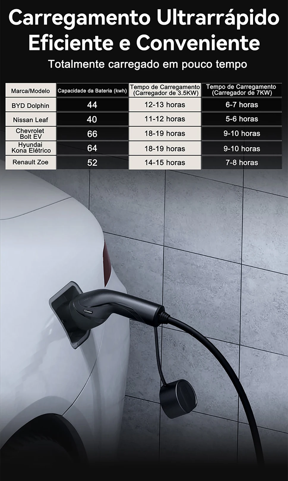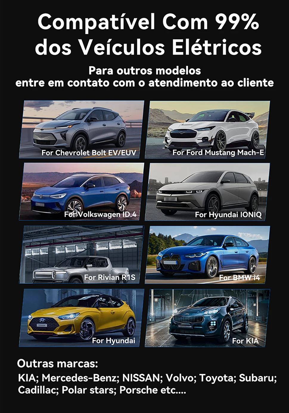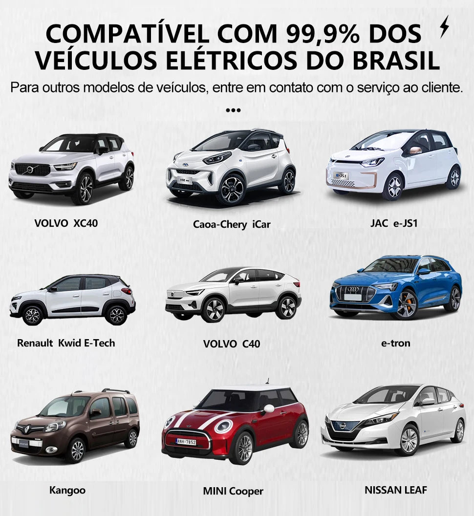 5. Broad Compatibility: Compatible with all electric vehicle brands and models in Brazil, including BYD Dolphin, BYD Song Plus PHEV, BYD Yuan Plus EV (Atto 3), Great Wall Motors ORA Cat, Volkswagen ID.4, Nissan Leaf, Chevrolet Bolt EV, Renault Zoe, BMW i3, and Tesla Model 3, etc, ensuring convenient use.